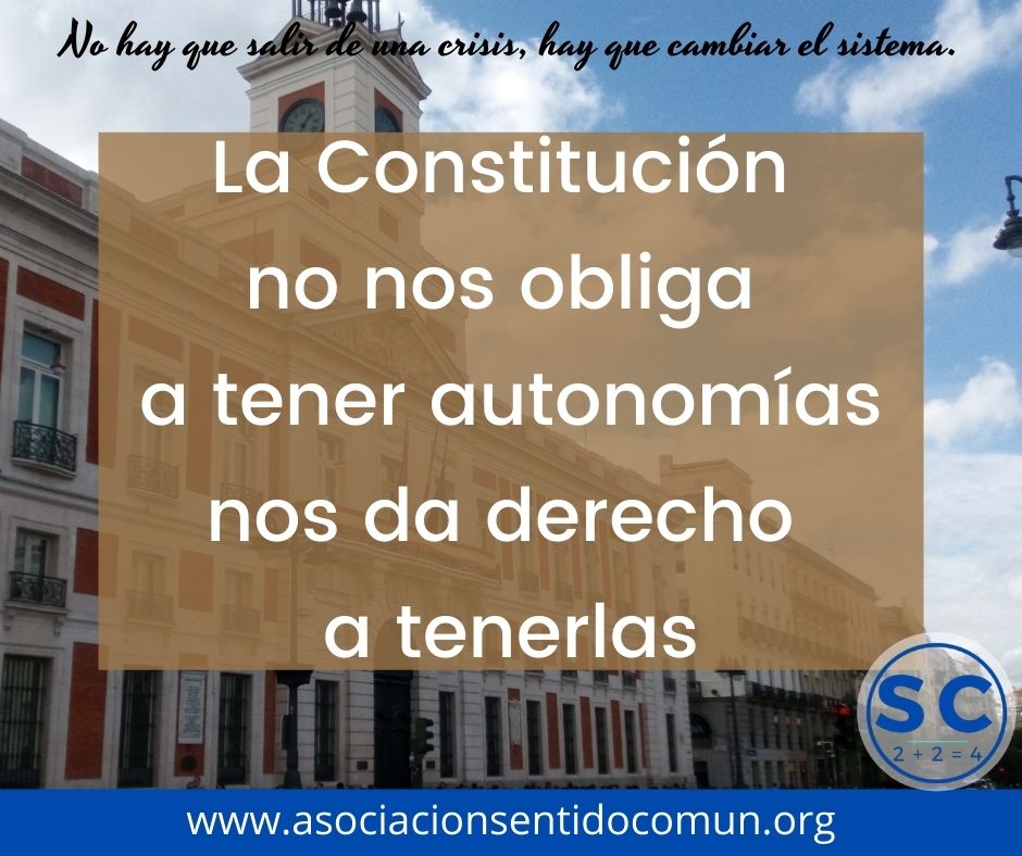 Se puede dejar de tener autonomías en España sin cambiar la Constitución. ¿Por qué? Porque las autonomías son un derecho, no una obligación. Por tanto, con la actual Constitución podemos tener autonomías, pero no estamos obligados a tenerlas. Es decir, con la actual Constitución, sin cambiarla en absoluto, podemos tener autonomías, y podemos no tener autonomías.