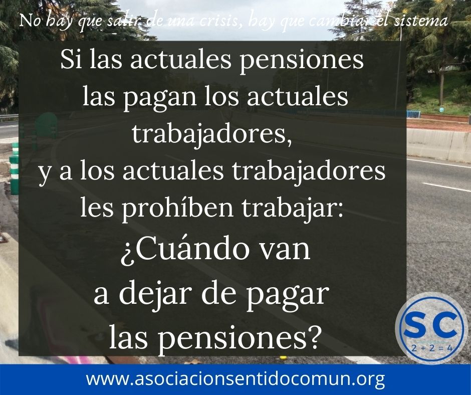 Así que si las actuales pensiones las pagan los actuales trabajadores, y a los actuales trabajadores les prohíben trabajar: ¿De dónde va a salir el dinero para pagar las pensiones? O, dicho de otra forma: ¿Cuándo van a dejar de pagar las pensiones? Porque, obviamente, si los trabajadores no pueden pagar las pensiones, no se pueden pagar las pensiones.